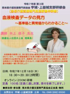 熊本県介護支援専門員協会 宇城・上益城支部研修会に12月18日お招きいただき、「血液検査データの見方」の題名で講演させていただきました。
